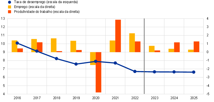 De acordo com as projeções, o mercado de trabalho manter‑se‑á resiliente, permanecendo o desemprego historicamente baixo ao longo do horizonte de projeção, perante uma continuação da escassez de oferta de mão de obra (gráfico 3). O emprego registou uma taxa de crescimento de 0,3% no quarto trimestre de 2022, não obstante a estagnação do crescimento real do PIB. Projeta‑se que continue a subir ao longo do horizonte de projeção, embora a um ritmo mais lento do que em 2022 (0,8% em 2023, 0,4% em 2024 e 0,3% em 2025). A subida do emprego segue‑se a uma diminuição do risco de uma recessão económica no curto prazo, não tendo o abrandamento da atividade real em 2023 resultado num aumento dos despedimentos. Pelo contrário, traduz‑se num aumento da acumulação de mão de obra perante a continuação da escassez da oferta de mão de obra. Consequentemente, espera‑se que o crescimento da produtividade diminua para 0,2% em 2023, recuperando depois para 1,2% em 2024 e 1,3% em 2025. Face à esperada continuação de uma ligeira expansão da população ativa, projeta‑se que, ao longo do horizonte de projeção, a taxa de desemprego permaneça em torno do nível atual de 6,6%.