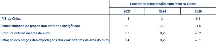 Este cenário considera uma recuperação mais forte da economia chinesa em comparação com a trajetória incluída nas projeções de referência, gerando também uma subida dos preços internacionais das matérias‑primas. O cenário pressupõe uma situação pandémica estável na China, sem novas grandes vagas de infeção por coronavírus e subsequentes medidas de contenção rigorosas. Esta situação levaria a uma recuperação mais célere da confiança dos consumidores e a uma retoma mais forte da procura, com efeitos positivos igualmente no setor imobiliário residencial. O cenário tem como pressuposto uma subida acentuada do ritmo da atividade económica, em particular a partir do segundo trimestre de 2023, com uma dissipação mais rápida do que nas projeções de referência do impacto negativo da grande vaga de infeções na viragem do ano. Tal deverá recolocar o PIB real da China na trajetória anterior à pandemia, impulsionando também a procura externa da área do euro[8]. Este cenário considera igualmente impactos em sentido ascendente sobre os preços internacionais das matérias‑primas, em especial os preços do gás, causados por uma recuperação mais forte da procura chinesa, que é provável que se traduza numa inflação mais elevada dos preços das exportações para concorrentes da área do euro. Pressupõe‑se, contudo, uma reversão destes efeitos em 2025 (quadro)[9].