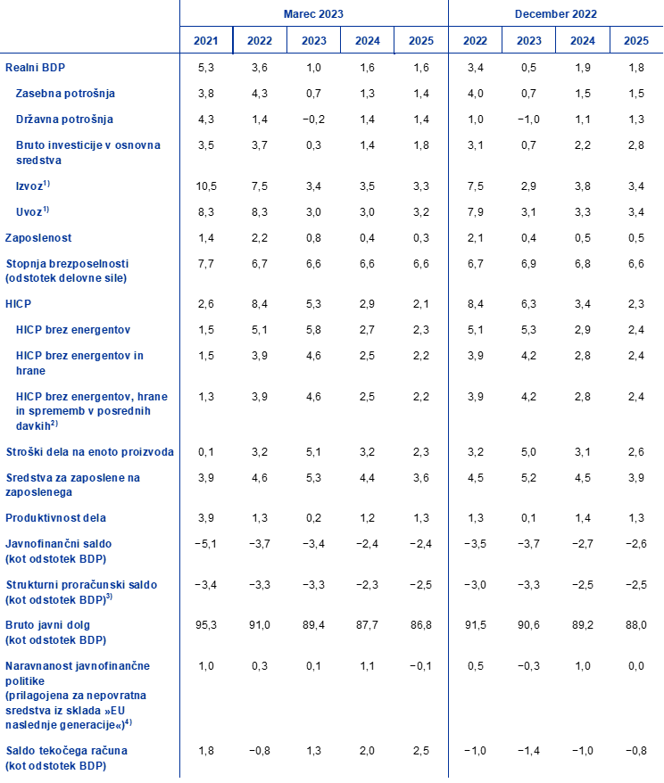 Opombe: Realni BDP in komponente, stroški dela na enoto proizvoda, sredstva za zaposlene na zaposlenega in produktivnost dela temeljijo na podatkih, ki so desezonirani in prilagojeni za število delovnih dni. Pretekli podatki se lahko razlikujejo od nazadnje objavljenih podatkov Eurostata, ker so bili objavljeni po presečnem datumu za projekcije.