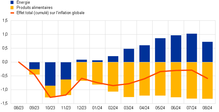Notes : L’incidence cumulée des effets de base est toujours indiquée par rapport à un mois de référence spécifique. Par exemple, les effets de base liés à l’énergie se traduiraient par une progression de 1,0 point de pourcentage de l’inflation globale en juin 2024 par rapport au taux d’inflation d’août 2023. De même, les effets de base liés à la composante produits alimentaires expliquent un ralentissement de 1,3 point de pourcentage de l’inflation globale en juin 2024 par rapport à août 2023. Au total, les effets de base liés aux produits alimentaires et à l’énergie entraînent un repli de 0,3 point de pourcentage de l’inflation globale en juin 2024 par rapport au taux enregistré en août 2023.