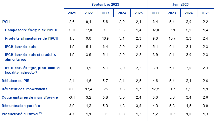 Par rapport aux projections de juin 2023, les projections d’augmentation de l’IPCH ont été révisées à la hausse de 0,2 point de pourcentage pour 2023 et 2024, et à la baisse de 0,1 point de pourcentage pour 2025. La composante énergie a été révisée à la hausse pour 2023 et 2024 en raison de données inattendues récentes, de la hausse des prix des contrats à terme sur le pétrole et de modifications des prix réglementaires. Ces révisions à la hausse ont été en partie contrebalancées par des révisions à la baisse des composantes hors énergie. L’augmentation des prix des produits alimentaires a été révisée à la hausse pour 2023, principalement en lien avec des données à la hausse inattendues, tandis que les révisions à la baisse pour 2024 et 2025 résultent d’une diminution des hypothèses techniques relatives aux prix au départ de l’exploitation dans la zone euro. L’inflation mesurée par l’IPCHX est inchangée pour 2023, mais a été révisée à la baisse pour 2024 et 2025 sous l’effet de l’appréciation de l’euro et de la détérioration des perspectives relatives à la demande.