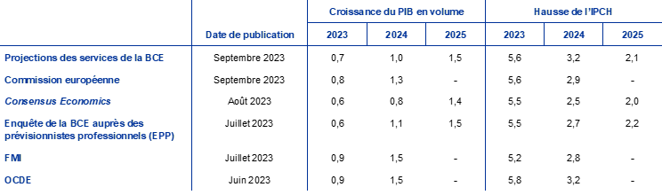 Les projections de septembre 2023 établies par les services de la BCE s’inscrivent à l’intérieur de la fourchette des autres prévisions relatives à la croissance du PIB et à l’inflation. La projection de croissance du PIB établie par les services de la BCE pour 2023 est légèrement supérieure aux prévisions du secteur privé et quelque peu inférieure à la mise à jour des Perspectives de l’économie mondiale du FMI, aux prévisions d’été (intermédiaires) de la Commission européenne et aux prévisions de l’OCDE. Pour 2024, la projections de la BCE figure parmi les prévisions les plus basses, mais elle est légèrement supérieure à celles du Consensus économique. Pour 2025, elle est similaire aux quelques autres prévisions disponibles pour cet horizon. S’agissant de la hausse de l’IPCH, la projection des services de la BCE pour 2024 figure parmi les prévisions les plus élevées et est conforme aux prévisions de l’OCDE, mais nettement supérieure à l’enquête du Consensus économique. Pour 2025, elle se situe dans la fourchette étroite des autres prévisions.