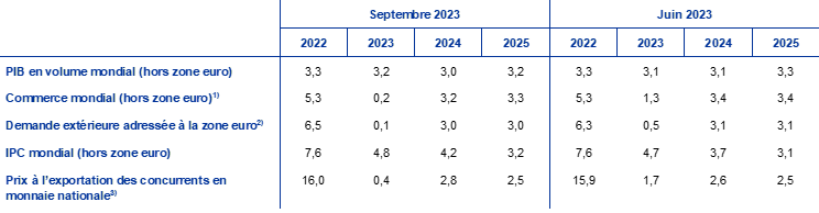 La date d’arrêté des hypothèses techniques, concernant notamment les prix du pétrole et les taux de change, est le 22 août 2023. Les projections pour l’économie mondiale ont été finalisées le 22 août 2023 et les projections macroéconomiques pour la zone euro le 30 août 2023. Malgré la finalisation de ces dernières la veille de la publication de l’estimation rapide d’Eurostat concernant l’IPCH de la zone euro pour août 2023, des estimations rapides nationales antérieures portant sur environ 45 % de l’IPCH de la zone euro ont été incluses dans les projections. Le présent exercice couvre la période 2023-2025. Il convient de tenir compte, dans l’interprétation de projections sur un horizon aussi long, de la très grande incertitude qui les entoure. Cf. « La performance des projections macroéconomiques établies par les services de l’Eurosystème et de la BCE depuis la crise financière », Bulletin économique, no 8, BCE, 2019. Vous pouvez également accéder aux données utilisées pour établir certains tableaux et graphiques en cliquant sur le lien suivant : http://www.ecb.europa.eu/pub/projections/html/index.fr.html. Par ailleurs, une base de données complète regroupant les précédentes projections macroéconomiques établies par les services de la BCE et de l’Eurosystème est disponible dans la base de données sur les projections macroéconomiques () du site de la BCE. À compter des projections de septembre 2023, la base de données est élargie pour inclure davantage de variables, souvent à un rythme trimestriel, que celles présentées dans ce rapport.