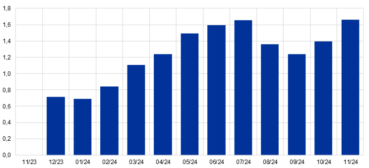 Hospodářská aktivita v eurozóně ve třetím čtvrtletí roku 2023 nepatrně poklesla, což odráželo záporný příspěvek snižování zásob k hospodářskému růstu, který byl vyvážen kladným příspěvkem domácí poptávky (graf 1). Hospodářský růst eurozóny ve třetím čtvrtletí roku 2023 činil -0,1 %, což je mírně pod úrovní nulového růstu očekávaného v projekcích ze září 2023.[2] Přidaná hodnota ve zpracovatelském průmyslu a stavebnictví ve třetím čtvrtletí nadále klesala, zatímco přidaná hodnota ve službách rostla. Pokud jde o složky poptávky, soukromá spotřeba se ve třetím čtvrtletí zvýšila, zejména v případě služeb, a to pravděpodobně za podpory ze strany služeb s vysokou mírou mezilidského kontaktu během letní sezóny, a v případě zboží dlouhodobé spotřeby. Naproti tomu pokles konkurenceschopnosti v důsledku vývoje směnných kurzů i cen energií vedl k poklesu vývozu.