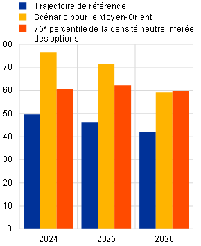 Dans un scénario tablant sur une intensification du conflit, les prix du pétrole et du gaz pourraient augmenter considérablement, notamment en cas de blocage partiel du détroit d’Ormuz. Le scénario suppose qu’environ un tiers du pétrole et du gaz transitant par le détroit d’Ormuz est perturbé, ce qui contribue à l’accroissement des tensions sur les marchés mondiaux de l’énergie. En conséquence, au deuxième trimestre 2024, les prix du pétrole et du gaz augmenteraient pour atteindre près de 130 dollars le baril et 83 euros par MWh respectivement (soit 57 % et 74 % au-dessus des niveaux anticipés dans les projections de référence). Dans l’ensemble, on suppose qu’un indice synthétique des prix de l’énergie (qui combine les prix du pétrole et du gaz) est supérieur de 64 % au scénario de référence au deuxième trimestre 2024 et reste supérieur de 36 % au scénario de référence en 2026 (cf. graphique A, partie a). Ce scénario est extrême, car il porterait les prix de l’énergie au-dessus du 75e percentile de la distribution tirée des options pour les contrats à terme sur l’énergie (cf. également l’encadré 4). Le détroit d’Ormuz n’a jamais été réellement bloqué, et l’hypothèse d’un choc d’offre de pétrole et de gaz est plus persistante que les chocs d’offre historiques, les marchés de l’énergie ayant tendance à se rééquilibrer plus rapidement.