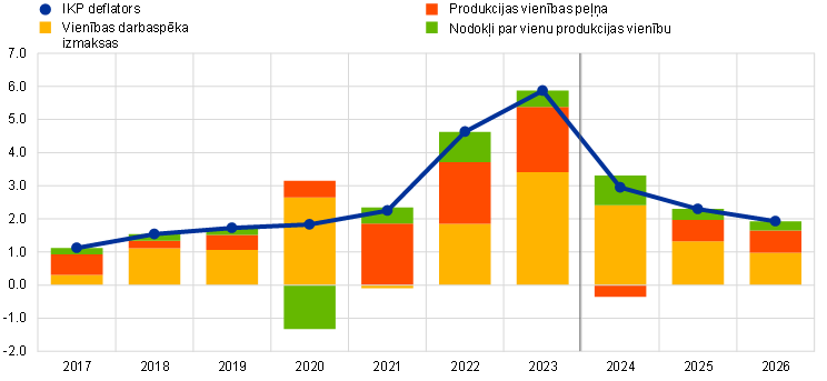 Sīkāku informāciju par IKP deflatora sadalījumu komponentos un vienības peļņas lomu inflācijas analīzē sk. ECB 2023. gada "Tautsaimniecības Biļetena" Nr. 4 ielikumu E. Hahn, How have unit profits contributed to the recent strengthening of euro area domestic price pressures? ("Kā vienības peļņa ir veicinājusi eurozonas iekšzemes cenu spiediena neseno pastiprināšanos?") un ECB 2023. gada 30. marta bloga ierakstu Arce, O., Hahn, E. and Koester, G., How tit-for-tat inflation can make everyone poorer ("Kā "dots pret dotu" inflācija visus padara nabadzīgākus").