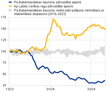 Piezīmes. a) panelī jūras tranzīta apjoms aprēķināts kā septiņu dienu mainīgais vidējais rādītājs, kura minimālais un maksimālais diapazons norāda uz pārvadāto apjomu vēsturisko attīstību laikposmā no 2019. līdz 2022. gadam un attiecībā pret attiecīgā gada 1. decembrī pārvadāto apjomu. b) panelī "BP paziņ." attiecas uz uzņēmuma British Petroleum paziņojumu, ka tas apturēs pārvadājumus Sarkanajā jūrā. d) panelī izmantota apvērsta ass, kur zemākie pasūtījumu piegādes laika IVI attiecībā uz globālajiem datiem (neietverot eurozonu) tika reģistrēti 2022. gada aprīlī, attiecībā uz ASV – 2021. gada jūlijā, attiecībā uz eurozonu – 2021. gada maijā un attiecībā uz Ķīnu un uz Apvienoto Karalisti – 2020. gada aprīlī. Jaunākie dati atbilst stāvoklim 2024. gada 11. februārī (jūras tranzīta apjoms), 2024. gada 26. februārī (naftas cenas un VIX svārstīguma indekss) un 2024. gada 23. februārī (pārvadājumu cenas).