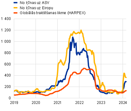 Avoti: SVF PortWatch, Bloomberg, Haver Analytics, HARPEX (Harper Petersen Charter Rates Index), Freightos Baltic Index (Freightos Baltic Index; FBX), S&P Global un ECB speciālistu aprēķini.