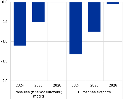Eurozonas tirdzniecības rādītājiem vajadzētu uzlaboties, lai gan pēc vēsturiskiem standartiem tā saglabāsies vāja. Eurozonas reālais eksports 2023. gada 3. ceturksnī turpināja sarukt, bet tiek lēsts, ka 4. ceturksnī tas atkal pieaudzis. Gaidāms, ka iespēju aplēšu periodā tas palielināsies pamatā atbilstoši ārējā pieprasījuma norisēm. Šajā sakarā pamataplēsē nav ietverta būtiska Sarkanās jūras traucējumu ietekme. Gaidāms, ka šie traucējumi būs īslaicīgi (aprakstu par pamatscenāriju sk. 2. ielikumā un par traucējumu eskalācijas scenāriju – 3. ielikumā). Salīdzinājumā ar 2023. gada decembra iespēju aplēsēm eurozonas eksporta tirgus daļa iespēju aplēšu periodā ir nedaudz lielāka, tomēr gaidāms, ka sakarā ar konkurētspējas problēmām, kas saistītas ar agrāko euro kursa kāpumu un pagātnes enerģijas šokiem, tā saglabāsies krietni mazāka nekā pirms pandēmijas. Importa rādītāji 2023. gada 3. ceturksnī bija pārsteidzoši zemi un gaidāms, ka īstermiņā tie pieaugs mērenāk, nekā prognozēts 2023. gada decembra iespēju aplēsēs, ko noteiks pieprasījuma komponentu ar augstu tirdzniecības īpatsvaru vāja dinamika. Paredzams, ka pēc tam imports atjaunosies atbilstoši pakāpeniskajam iekšzemes pieprasījuma atveseļošanās procesam. Kopumā paredzams, ka neto tirdzniecības kāpums, kas saskaņā ar jaunākajiem datiem bijis spēcīgāks, nekā gaidīts, īstermiņā saglabāsies nedaudz straujāks. Paredzams, ka tās devums IKP 2024. un 2025. gadā kopumā kļūs neitrāls un 2026. gadā nedaudz veicinās pieaugumu (2. att.). Paredzams, ka tirdzniecības nosacījumi īstermiņā turpinās uzlaboties galvenokārt zemāku importa cenu dēļ, atspoguļojot enerģijas cenu kritumu. Tas nozīmē, ka tekošā konta bilance pieaugs un, kā paredzams, ar 2024. gadu atgriezīsies līmenī, kāds bija pirms enerģijas krīzes.