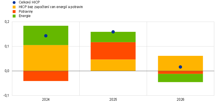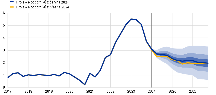 Předpokládá se, že celková inflace bude v blízké budoucnosti celkově kolísat a následně se v průběhu roku 2025 dále zmírní na úroveň blízkou cílové hodnotě. Tento vývoj odráží zmírnění nákladových tlaků, a to i ze strany práce, a zpožděný dopad dřívějšího zpřísnění měnové politiky, který se postupně promítá do spotřebitelských cen. Celková inflace měřená harmonizovaným indexem spotřebitelských cen (dále též „HICP“) by měla po zbytek roku 2024 vykazovat určitou volatilitu v důsledku vlivu srovnávací základny a vyšších cen energetických komodit. Ve střednědobém horizontu by se růst cen energií měl ustálit na nízkých kladných hodnotách vzhledem k tržním očekáváním ohledně budoucího vývoje cen ropy a plynu a plánovaným fiskálním opatřením souvisejícím se změnou klimatu. V posledních čtvrtletích výrazně pokleslo tempo růstu cen potravin, neboť se s nižšími cenami energetických a potravinářských komodit zmírnily tlaky v dodavatelských řetězcích. Pokud jde o další vývoj, očekává se, že růst cen potravin se bude pohybovat kolem současné úrovně a od konce roku 2025 bude dále zmírňovat. Inflace měřená HICP bez započtení cen energií a potravin (dále též „HICPX“) by měla po většinu horizontu projekcí zůstat nad celkovou inflací, ale předpokládá se, že bude pokračovat v dezinflačním vývoji, i když pomalým tempem a zejména v letech 2025 a 2026. Ústředním prvkem této projekce je očekávané postupné uvolňování tempa růstu nominálních mezd z původně stále zvýšené úrovně s tím, jak odeznívají stimulující dopady tlaků spojených s inflačními kompenzacemi v podmínkách napjaté situace na trhu práce. Očekávané oživení růstu produktivity by mělo podpořit zmírnění tlaků na růst nákladů práce. Růst zisku by měl navíc oslabit a částečně tlumit promítání nákladů práce do cen, zejména v roce 2024. V souhrnu se předpokládá, že roční průměrná celková inflace měřená HICP poklesne z 5,4 % v roce 2023 na 2,5 % v roce 2024, 2,2 % v roce 2025 a 1,9 % v roce 2026. V porovnání s makroekonomickými projekcemi z března 2024 byla inflace měřená HICP v letech 2024 a 2025 revidována o 0,2 procentního bodu směrem nahoru. Důvodem jsou především vyšší ceny energetických komodit a mírně vyšší než očekávané aktuální údaje o inflaci měřené HICPX. Navíc se očekává, že tlaky na růst nákladů práce budou o něco silnější v důsledku vyššího růstu mezd spolu s mírně opatrnějším výhledem růstu produktivity. Výhled celkové inflace i inflace měřené HICPX pro rok 2026 zůstává beze změny.