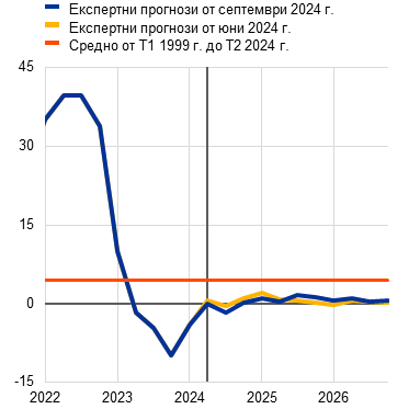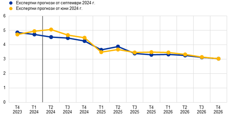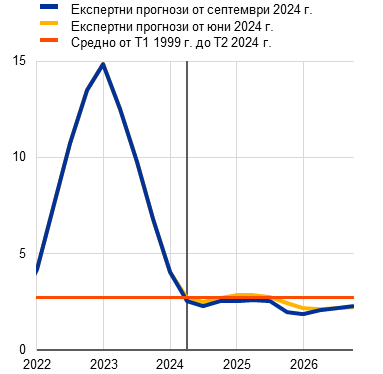 След като неотдавна общата инфлация отслабна, се прогнозира, че тя ще нарасне в известна степен през последното тримесечие на годината, а след това до края на 2025 г. ще продължи да спада към целевото равнище. Очакваното увеличение в краткосрочен план е до голяма степен в резултат от енергийни базови ефекти. В средносрочен план енергийната инфлация би трябвало да се установи на ниски положителни равнища предвид пазарните очаквания за енергийните суровини и цените на едро и планираните фискални мерки, свързани с изменението на климата. Инфлацията на цените на храните спадна значително през последните тримесечия с отслабването на натиска по веригата поради по-ниските цени на енергийните и хранителните суровини. Очаква се инфлацията на цените на храните да остане в общи линии без промяна и след края на 2025 г. да намалее още. Според прогнозите ХИПЦ инфлацията без компонентите енергоносители и храни ще се задържи над нивото на общата инфлация през почти целия прогнозен период, но процесът на дезинфлация при нея ще продължи. Инфлацията при услугите остана устойчиво висока през последните месеци. Все пак по-късно през прогнозния период се очаква постепенен спад, като прирастът на заплатите и натискът от страна на други разходи ще отслабнат, докато забавеното въздействие от затягането на паричната политика в предходния период продължава да намира отражение в потребителските цени. През последните тримесечия растежът на номиналните заплати започна да спада от високите си равнища с по-бърз темп от прогнозираното. През следващите години се очаква прирастът на заплатите постепенно да се забавя още с отслабването на възходящите въздействия от натиска, свързан с мерките за компенсиране на инфлацията, в условията на затегнат пазар на труда. Възобновено нарастване на производителността би трябвало да допринесе за отслабване на натиска от страна на разходите за труд. Освен това прирастът на печалбата се понижи значително и ще осигурява частичен буфер срещу пренасянето на разходите за труд върху цените, особено в краткосрочен план. Като цяло се очаква средногодишната обща ХИПЦ инфлация да намалее от 5,4% през 2023 г. до 2,5% през 2024 г,. 2,2% през 2025 г. и 1,9% през 2026 г. В сравнение с прогнозите от юни 2024 г. перспективата за ХИПЦ инфлацията остава непроменена. През последните месеци ХИПЦ инфлацията без компонентите енергоносители и храни беше малко по-висока от очакваното, което доведе до лека възходяща корекция за 2024 г. и 2025 г.