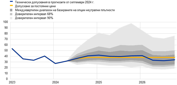 В сравнение с прогнозите от юни 2024 г. основните промени в техническите допускания са по-ниски цени на суровините (макар че някои енергийни цени са по-високи), по-силно евро и малко по-ниски лихвени проценти. Допусканията за цените на петрола въз основа на цените на фючърсите са ревизирани надолу с около 2% през прогнозния период. Спот цената остава над тази на фючърсите и спада с около 12% между 2024 г. и 2026 г. За разлика от това опасенията относно геополитическите рискове, свързани с напрежението в Близкия изток и неотдавнашното навлизане на украински войски на руска територия, доведоха до допускания за по-високи цени на едро на природния газ (увеличение със 17% през прогнозния период). Допусканията за цените на едро на електроенергията също са ревизирани нагоре, особено към края на прогнозния период. Допуска се, че еврото леко ще поскъпне (с 1,7% спрямо щатския долар, отразявайки главно очакванията за значително намаляване на лихвените проценти от страна на Системата на Федералния резерв, и с 0,7% в ефективно номинално изражение). Пазарните очаквания за краткосрочните лихвени проценти за 2025 г. и 2026 г. са ревизирани надолу с около 30 базисни пункта. Пазарните очаквания за доходността на дългосрочните облигации също са ревизирани надолу, макар и в по-малка степен.