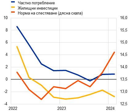 а) Частно потребление, жилищни инвестиции и норма на спестяване