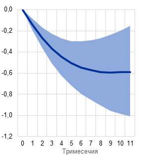 Емпиричният модел показва, че неочаквани промени в доверието на потребителите имат съществени последици за частното потребление, жилищните инвестиции и нормата на спестяване. Оценява се структурен авторегресивен векторен модел по метода на Байес (SBVAR), като се използват данни за еврозоната от първото тримесечие на 1999 г. до четвъртото тримесечие на 2019 г. Включени са доверието на потребителите, частното потребление, жилищните инвестиции, лихвеният процент, реалният разполагаем доход и дефлаторът на частното потребление. В модела се прилага рекурсивна идентификационна схема, за да се установи въздействието на шоковете в доверието на потребителите.[14] Въздействието на негативен шок в доверието на потребителите в размер на едно стандартно отклонение води до най-голям спад с около 0,8% на разполагаемия доход и 0,6% на частното потребление след около осем тримесечия. В резултат на това се получава нарастване на нормата на спестяване до върхова стойност с около 0,9 процентни пункта след шест тримесечия.[15] Жилищните инвестиции също намаляват след неблагоприятен шок в доверието, като в най-ниската им точка спадът е с 1,2%, след около седем тримесечия. Тези резултати показват, че влошаване на доверието на потребителите трайно възпира разходите и инвестициите на домакинствата, като същевременно стимулира склонността им към спестяване, включително и поради предпазни съображения.