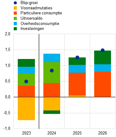 Op middellange termijn zal het reële bbp naar verwachting groeien in een tempo dat vergelijkbaar is met het historische gemiddelde, ondersteund door stijgende reële inkomens, een aantrekkende buitenlandse vraag en het wegebben van het remmende effect vanuit het monetaire beleid. De aanhoudende groei van de reëel besteedbare inkomens ondersteunt de consumptieve bestedingen en zou in de tweede helft van 2024 de belangrijkste motor achter de groei moeten worden, zij het in mindere mate dan in de projecties van juni werd voorzien. Ook de bestedingen van huishoudens profiteren naar verwachting van de veerkrachtige arbeidsmarkt, het geleidelijk toenemende consumentenvertrouwen en de afnemende onzekerheid, ondanks de momenteel hoge neiging tot sparen. De bedrijfsinvesteringen blijven op korte termijn zwak, deels als gevolg van toegenomen politieke onzekerheid. Daarna wordt echter in een herstel voorzien doordat de druk vanuit het beëindigde verkrappende monetaire beleid afneemt, en er steun komt vanuit zowel de binnenlandse als buitenlandse vraag. Ook de uitvoergroei zal door de buitenlandse vraag worden gestimuleerd. De verwachting voor de investeringen in woningen is eerst nog een krimp in 2024 en 2025, maar daarna een herstel, vergelijkbaar met het verloop dat in de projecties van juni is geschetst. De normalisering van de voorraadcyclus levert in de tweede helft van 2024 een min of meer neutrale bijdrage aan de groei, terwijl die bijdrage rond de jaarwisseling nog duidelijk negatief was. Ondanks een voorziene verkrapping van de begrotingskoers gedurende de projectieperiode, gaan de overheidsconsumptie en -investeringen naar verwachting positief bijdragen aan de bbp-groei.