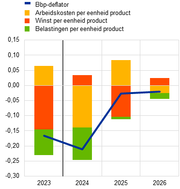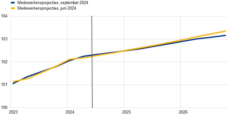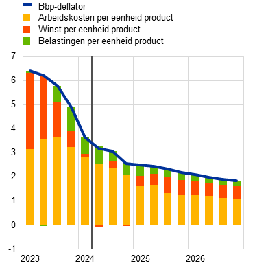 Na de recente matiging stijgt de totale inflatie naar verwachting in het laatste kwartaal van dit jaar licht, alvorens tegen eind 2025 verder te dalen naar de inflatiedoelstelling. De op korte termijn verwachte stijging is grotendeels het gevolg van basiseffecten bij energie. Gezien de marktverwachtingen ten aanzien van energiegrondstoffen- en groothandelsprijzen en geplande begrotingsmaatregelen in verband met klimaatverandering zou de energie-inflatie zich op middellange termijn op een laag, positief peil moeten stabiliseren. De voedselprijsinflatie is de afgelopen kwartalen sterk gedaald doordat de prijsdruk binnen de productieketen is afgenomen vanwege de lagere prijzen van energie en voedingsgrondstoffen. De voedselprijsinflatie zal naar verwachting min of meer zijwaarts evolueren alvorens vanaf eind 2025 verder te matigen. Naar verwachting blijft de HICP-inflatie exclusief energie en voedingsmiddelen (HICPX) bijna de gehele projectieperiode boven de totale inflatie, maar zet wel de desinflatoire ontwikkeling voort. De diensteninflatie is de afgelopen maanden hardnekkig hoog gebleven. Later in de projectieperiode wordt echter nog steeds een geleidelijke daling verwacht, waarbij de loongroei en andere kostendruk afnemen, terwijl de vertraagde invloed van eerdere monetaire beleidsverkrapping blijft doorwerken in de consumptieprijzen. In de afgelopen kwartalen is de nominale loongroei vanaf een hoog niveau, en meer dan eerder geraamd, gaan dalen. Voor de komende jaren wordt een verdere geleidelijke matiging van de loongroei verwacht, naarmate de opwaartse invloed van de druk door inflatiecompensatie in een krappe arbeidsmarkt verder wegebt. De matiging van de arbeidskostendruk zou worden ondersteund door een herstel van de productiviteitsgroei. Bovendien is de winstgroei aanzienlijk afgenomen en deze zal deels een buffer vormen tegen de doorwerking van de arbeidskosten in de prijzen, met name op korte termijn. Al bij al daalt de totale HICP-inflatie op jaarbasis naar verwachting van gemiddeld 5,4% in 2023 naar 2,5% in 2024, 2,2% in 2025 en 1,9% in 2026. Vergeleken met de projecties van juni 2024 zijn de vooruitzichten voor de HICP-inflatie onveranderd. De HICPX-inflatie verraste de afgelopen maanden licht opwaarts, wat leidde tot kleine opwaartse bijstellingen in 2024 en 2025.