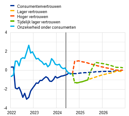 Toelichting: In paneel b) zijn de gegevens gestandaardiseerd voor de volledige beschikbare steekproef – van januari 1999 tot en met augustus 2024 voor het vertrouwen en van april 2019 tot en met juli 2024 voor de onzekerheid. De onderbroken blauwe lijn verwijst naar een projectie van het consumentenvertrouwen die aansluit bij de basisprojecties van het empirische model zoals in Grafiek B beschreven. De in de grafiek weergegeven alternatieve ontwikkelingen van het consumentenvertrouwen worden hieronder beschreven. De verticale lijn in paneel b) geeft het begin van de huidige projectieperiode aan. De meest recente waarnemingen betreffen het eerste kwartaal van 2024 voor paneel a) en augustus 2024 voor paneel b).