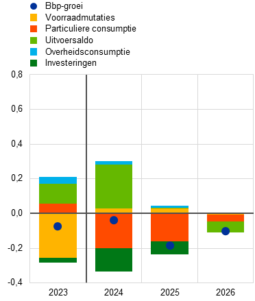 Ten opzichte van de projecties van juni 2024 is de groei van het reële bbp in elk jaar van de projectieperiode naar beneden bijgesteld met 0,1 procentpunt (Tabel 3 en Grafiek 2). De historische gegevens van het reële bbp zijn voor de tweede helft van 2023 naar boven bijgesteld, waardoor de doorwerking hiervan in 2024 hoger is. Dit werd echter ruimschoots gecompenseerd door neerwaartse bijstellingen van de driemaandelijkse groeicijfers voor 2024. Op componentniveau zijn de particuliere consumptie en de investeringen voor 2024 naar beneden bijgesteld. Hoewel het uitvoersaldo naar boven is bijgesteld (voornamelijk naar aanleiding van actuele cijfers), is de groei van de uitvoer in de tweede helft van 2024 naar beneden bijgesteld vanwege aanhoudende problemen op het gebied van concurrentievermogen. De neerwaartse bijstelling voor 2025 vloeit volledig voort uit de overloopeffecten van de bijstellingen in de tweede helft van 2024. Voor 2026 houdt de verandering echter voornamelijk verband met een neerwaartse bijstelling van de groei van de particuliere consumptie door een iets zwakker herstel dan eerder verwacht, en een lichte neerwaartse bijstelling van de bijdrage van het handelssaldo.
