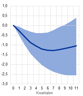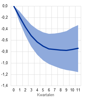 Toelichting: Het model wordt geraamd op basis van gegevens over het consumentenvertrouwen, de particuliere consumptie, de investeringen in woningen, de rente, het reëel besteedbaar inkomen en de deflator van de particuliere consumptie in het eurogebied tussen het eerste kwartaal van 1999 en het vierde kwartaal van 2019. De rente wordt berekend als een gemiddelde van de korte en lange overheidsrente. De variabelen worden in het model als ‘log levels’ opgenomen, met uitzondering van de rente. Het model hanteert vier ‘lags’. Er wordt uitgegaan van een Cholesky-identificatiesysteem met op de eerste plaats de deflator van de particuliere consumptie, gevolgd door het reëel besteedbaar inkomen, de particuliere consumptie, de investeringen in woningen, de rentetarieven en het consumentenvertrouwen. De in de grafiek getoonde reacties zijn genormaliseerd tot een schok met een daling van één standaardafwijking in het consumentenvertrouwen. De blauwe gebieden geven de 68%-betrouwbaarheidsintervallen aan. De effecten op de spaarquote worden berekend op basis van de modelmatige effecten van vertrouwensschokken op het reëel besteedbaar inkomen en de reële particuliere consumptie; de impliciete ontwikkelingen van de spaarquote worden weergegeven in Grafiek C.
