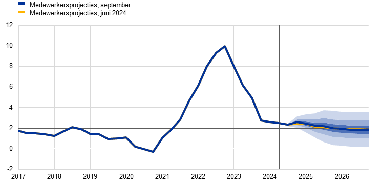 Projecties ECB-medewerkers | September 2024 | 0,8 | 1,3 | 1,5 | 2,5 | 2,2 | 1,9 | 2,9 | 2,3 | 2,0 |