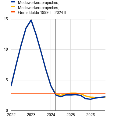 De arbeidsmarkt blijft veerkrachtig, hoewel de groei van de werkgelegenheid in vergelijking met de afgelopen jaren zal vertragen. De werkgelegenheid steeg in het tweede kwartaal van 2024 met 0,2%, iets hoger dan verwacht. Gedurende de projectieperiode wordt een tamelijk gematigd groeitempo van 0,1% per kwartaal voorzien. Op jaarbasis neemt de groei van de werkgelegenheid af van 1,4% in 2023 tot 0,8% in 2024, om vervolgens te stabiliseren op 0,4% in 2025 en 2026. Dit omvat een lichte neerwaartse bijstelling met 0,1 procentpunt voor 2026 in vergelijking met de vorige projecties. Het verloop van de werkgelegenheid (Grafiek 3) weerspiegelt de aanname dat conjuncturele factoren die de werkgelegenheid recent meer dan gewoonlijk hebben ondersteund – zoals aanzienlijke tekorten aan arbeidskrachten, hoge winstgroei, zwakke reële lonen en een robuuste groei van de beroepsbevolking – geleidelijk zullen wegebben.[7]