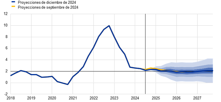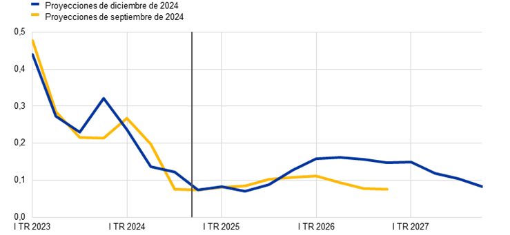Proyecciones de los expertos del Eurosistema | Diciembre de 2024 | 0,7 | 1,1 | 1,4 | 1,3 | 2,4 | 2,1 | 1,9 | 2,1 | 2,9 | 2,3 | 1,9 | 1,9 |