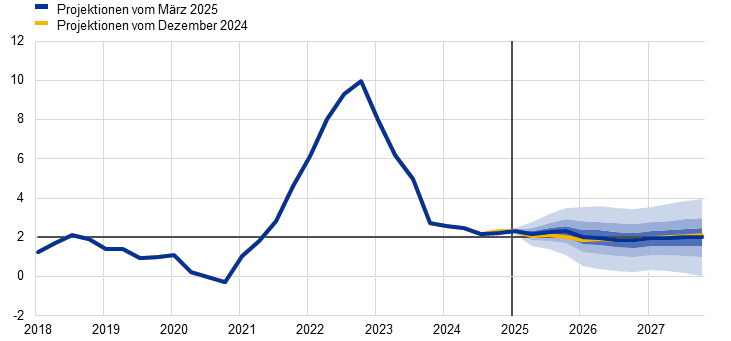 Die neue US-Regierung hat ein breites Spektrum von Zöllen angekündigt, von denen einige in den Basisprojektionen vom März 2025 enthalten sind. Wenngleich es nach wie vor schwierig ist abzuschätzen, inwieweit die handelspolitischen Ankündigungen der USA zum Tragen kommen, wurden Zölle, die bereits zum Zeitpunkt der Finalisierung der Projektionen vom März 2025 (d. h. am 19. Februar 2025) in Kraft waren, im Basisszenario berücksichtigt, nämlich die erste Reihe von bilateralen Zölle zwischen den Vereinigten Staaten und China. Andere Zölle, die zum Redaktionsschluss noch nicht in Kraft (z. B. US-Zölle auf Stahl und Aluminium) oder aufgeschoben worden waren (US-Zölle gegen Mexiko und Kanada), oder die erst kürzlich angekündigt wurden (US-Zölle gegen die EU und Zusatzzölle gegen China), sind in den Basisprojektionen nicht berücksichtigt.