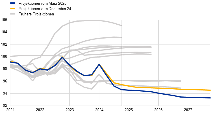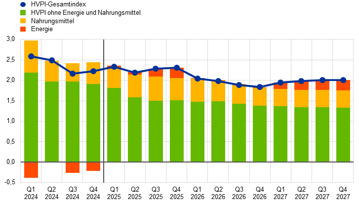 Die HVPI-Gesamtinflation ist in den letzten Monaten gestiegen. Sie dürfte sich aber im Laufe des Jahres 2025 leicht abschwächen, bevor sie dann sinken und sich ab dem ersten Quartal 2026 um das Inflationsziel der EZB von 2,0 % bewegen dürfte. Zu Beginn des Projektionszeitraums dürften aufwärtsgerichtete Basiseffekte bei der Energiekomponente und ein höherer Preisauftrieb bei Nahrungsmitteln die Abwärtseffekte, die sich aus einem Rückgang der HVPI-Inflation ohne Energie und Nahrungsmittel (HVPIX) ergeben, weitgehend ausgleichen. Der Anstieg der Energierohstoffpreise zum Jahreswechsel wird sich 2025 in der Jahresänderungsrate der Energiepreise niederschlagen. Obwohl davon ausgegangen wird, dass die Öl- und Gaspreise im Einklang mit den Terminpreisen sinken werden, dürfte die Inflationsrate für Energie über den gesamten Projektionszeitraum hinweg weiterhin im positiven Bereich liegen, wenn auch unter dem historischen Durchschnitt. Im Jahr 2027 dürfte die Teuerung bei Energie durch die Einführung neuer Klimaschutzmaßnahmen Auftrieb erhalten. Die Teuerung bei Nahrungsmitteln wird den Projektionen zufolge bis Mitte 2025 anziehen, hauptsächlich aufgrund des jüngsten kräftigen Anstiegs der Nahrungsmittelrohstoffpreise. Danach wird sie zurückgehen und im Jahr 2027 bei durchschnittlich 2,2 % liegen. Die HVPIX-Inflation dürfte Anfang 2025 zu sinken beginnen, da der Effekt der verzögerten Preisanpassung nachlässt, der Lohndruck zurückgeht und die Auswirkungen der zurückliegenden geldpolitischen Straffung weiterhin auf die Verbraucherpreise durchschlagen. Hauptursache für die rückläufige Entwicklung der HVPIX-Inflation wird den Erwartungen zufolge ein Rückgang des bisher recht hartnäckigen Preisauftriebs bei Dienstleistungen sein. Insgesamt dürfte sich die HVPIX-Inflation von 2,2 % im Jahr 2025 auf 1,9% im Jahr 2027 abschwächen. Das zurzeit immer noch erhöhte Lohnwachstum dürfte sich weiter verlangsamen, da der vom Inflationsausgleich ausgehende Druck nachlässt. In Verbindung mit der erwarteten Erholung des Produktivitätswachstums dürfte dies dazu führen, dass die Lohnstückkosten deutlich langsamer steigen. Der inländische Preisdruck dürfte infolgedessen weiter nachlassen, und die Gewinnmargen dürften sich über den Projektionszeitraum hinweg erholen. Der externe Preisdruck, der sich in den Einfuhrpreisen widerspiegelt, dürfte unter der Annahme einer unveränderten EU-Handelspolitik in Bezug auf die Zölle moderat bleiben. Im Vergleich zu den Projektionen vom Dezember 2024 sind die Aussichten für die HVPI-Gesamtinflation für 2025 um 0,2 Prozentpunkte nach oben revidiert worden. Ausschlaggebend hierfür waren die Annahme höherer Energierohstoffpreise und die Abwertung des Euro. Für 2027 sind sie indessen geringfügig nach unten angepasst worden, was den etwas schwächeren Aussichten für die Energiekomponente am Ende des Projektionszeitraums geschuldet ist.