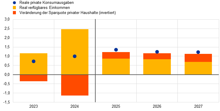 Mittelfristig wird eine Zunahme des Wachstums des realen BIP erwartet. Getragen werden dürfte es von der Belebung des Konsums, steigenden Investitionen, der Auslandsnachfrage und dem Nachlassen der dämpfenden Effekte früherer restriktiver geldpolitischer Maßnahmen (siehe Tabelle 3). Die dank des robusten Lohn- und Beschäftigungswachstums und der sinkenden Inflation weiter steigende Kaufkraft der privaten Haushalte dürfte das Wachstum der privaten Konsumausgaben stützen. Den Projektionen zufolge dürften die Ausgaben der privaten Haushalte die Erholung auf mittlere Sicht weiter stützen, auch getragen von einem Rückgang der derzeit immer noch erhöhten Sparquote der privaten Haushalte. Auch der robuste Arbeitsmarkt, der sich allerdings abkühlt, und die angenommene allmähliche Erholung des Verbrauchervertrauens dürften das Wachstum der privaten Konsumausgaben begünstigen. Die Investitionen dürften sich über den Projektionszeitraum hinweg schrittweise erhöhen. Maßgeblich hierfür dürften in erster Linie die nachlassende Bremswirkung der vorangegangenen geldpolitischen Straffung, steigende Gewinne, der Einsatz von Mitteln aus dem Programm „Next Generation EU“ (NGEU) sowie die anziehende Binnen- und Auslandsnachfrage sein. Letztere dürfte auch das Exportwachstum stützen. Allerdings werden die handelspolitische Unsicherheit und die anhaltenden Wettbewerbsprobleme des Euroraums voraussichtlich weiterhin Einbußen bei Exportmarktanteilen verursachen. Die andauernde Rücknahme der diskretionären finanzpolitischen Stützungsmaßnahmen, die als Reaktion auf die Pandemie und die Energiekrise ergriffen wurden, dürfte sich auch im Zeitraum 2025 bis 2027 leicht negativ im BIP-Wachstum niederschlagen.
