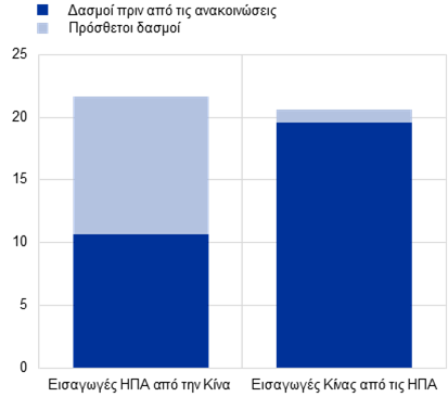 Η επίδραση αυτών των διμερών δασμών στις προβολές για τη ζώνη του ευρώ είναι περιορισμένη, αν και η Κίνα θα μπορούσε να επαναλάβει προηγούμενες τάσεις εκτροπής του εμπορίου. Το 2018 οι δασμοί των ΗΠΑ επί κινεζικών προϊόντων οδήγησαν σε ανακατεύθυνση των κινεζικών εξαγωγών προς άλλες αγορές, καθώς οι αλυσίδες εφοδιασμού των ΗΠΑ αναδιαμορφώθηκαν με σκοπό να μειωθεί η απευθείας προμήθεια αγαθών από την Κίνα. Εάν η Κίνα εκτρέψει τις εξαγωγές της από τις ΗΠΑ, η ζώνη του ευρώ ενδέχεται να υποστεί απώλεια ανταγωνιστικότητας τόσο σε εγχώριο επίπεδο όσο και σε τρίτες αγορές. Ταυτόχρονα, η δυνατότητα της ζώνης του ευρώ να αυξήσει το μερίδιο αγοράς της στις ΗΠΑ μπορεί να είναι περιορισμένη, λόγω διαφορών τόσο ως προς την ποιότητα όσο και ως προς τις τιμές των προϊόντων που συνήθως εξάγει σε σύγκριση με τις εξαγωγές της Κίνας. Ωστόσο, συνολικά, η επίδραση αυτών των δασμών στον ρυθμό ανάπτυξης της ζώνης του ευρώ αναμένεται να είναι μόνο οριακά αρνητική. Όσον αφορά τον πληθωρισμό της ζώνης του ευρώ, οι δασμοί που περιλαμβάνονται στο βασικό σενάριο φαίνεται να έχουν ελάχιστες επιπτώσεις, καθώς η ανοδική επίδρασή τους στις τιμές των εισαγομένων μέσω του υψηλότερου κόστους κατά μήκος των αλυσίδων προσφοράς αναμένεται να αντισταθμιστεί σε γενικές γραμμές από την καθοδική επίδραση της αύξησης της προσφοράς αγαθών από την Κίνα στις ευρωπαϊκές αγορές.