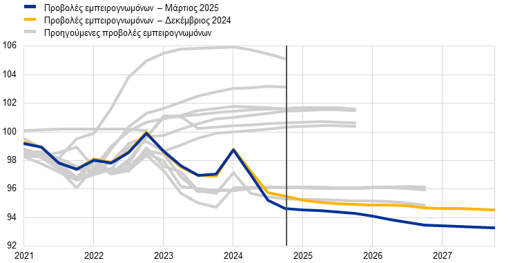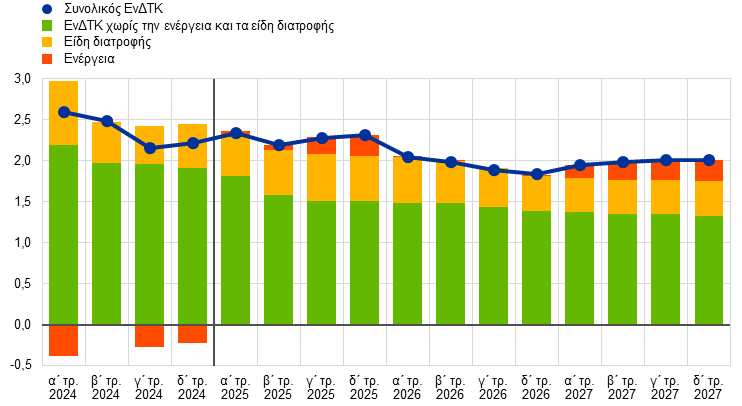Ο γενικός πληθωρισμός βάσει του ΕνΔΤΚ αυξήθηκε τους τελευταίους μήνες αλλά, σύμφωνα με τις προβολές, αναμένεται να επιβραδυνθεί οριακά στη διάρκεια του 2025 και στη συνέχεια να μειωθεί και να κυμανθεί γύρω από τον στόχο της ΕΚΤ για πληθωρισμό 2,0% από το α΄ τρίμηνο του 2026. Στην αρχή του χρονικού ορίζοντα προβολής, οι ανοδικές επιδράσεις της βάσης σύγκρισης στη συνιστώσα της ενέργειας και ο υψηλότερος πληθωρισμός των τιμών των ειδών διατροφής αναμένεται να αντισταθμίσουν σε γενικές γραμμές τις καθοδικές επιδράσεις από τη μείωση του πληθωρισμού βάσει του ΕνΔΤΚ χωρίς την ενέργεια και τα είδη διατροφής (HICPX). Η αύξηση των διεθνών τιμών των ενεργειακών εμπορευμάτων κατά την αλλαγή του έτους θα επηρεάσει τον ετήσιο ρυθμό μεταβολής των τιμών της ενέργειας το 2025. Παρόλο που οι τιμές του πετρελαίου και του φυσικού αερίου, βάσει των υποθέσεων, θα μειωθούν σύμφωνα με τις τιμές των συμβολαίων μελλοντικής εκπλήρωσης, ο πληθωρισμός της ενέργειας είναι πιθανόν να συνεχίσει να καταγράφει θετικούς ρυθμούς, αν και χαμηλότερους από τον ιστορικό μέσο όρο σε όλη τη διάρκεια του χρονικού ορίζοντα προβολής. Το 2027 ο πληθωρισμός της ενέργειας φαίνεται να ενισχύεται από τη θέσπιση νέων μέτρων για τον περιορισμό της κλιματικής αλλαγής. Ο πληθωρισμός των ειδών διατροφής προβλέπεται να αυξηθεί έως τα μέσα του 2025, κυρίως λόγω των πρόσφατων έντονων αυξήσεων των διεθνών τιμών των τροφίμων και στη συνέχεια να μειωθεί σε 2,2% κατά μέσο όρο το 2027. Ο πληθωρισμός βάσει του HICPX αναμένεται να αρχίσει να υποχωρεί στις αρχές του 2025 καθώς θα εξασθενούν οι επιδράσεις της ανατιμολόγησης που εκδηλώνονται με χρονική υστέρηση, οι μισθολογικές πιέσεις θα υποχωρούν και ο αντίκτυπος της προηγούμενης αυστηροποίησης της νομισματικής πολιτικής θα εξακολουθεί να μετακυλίεται στις τιμές καταναλωτή. Η μείωση του πληθωρισμού βάσει του HICPX αναμένεται να προέλθει κυρίως από την υποχώρηση του πληθωρισμού των υπηρεσιών, ο οποίος μέχρι στιγμής υπήρξε σχετικά επίμονος. Συνολικά, ο πληθωρισμός βάσει του HICPX προβλέπεται να αποκλιμακωθεί από 2,2% το 2025 σε 1,9% το 2027. Ο ρυθμός αύξησης των μισθών αναμένεται να συνεχίσει να ακολουθεί καθοδική πορεία από τα τρέχοντα επίπεδα τα οποία εξακολουθούν να είναι υψηλά, καθώς εξασθενούν οι πιέσεις που συνδέονται με την αντιστάθμιση του πληθωρισμού. Σε συνδυασμό με την προσδοκώμενη ανάκαμψη του ρυθμού αύξησης της παραγωγικότητας, αυτό αναμένεται να οδηγήσει σε σημαντικά βραδύτερη αύξηση του κόστους εργασίας ανά μονάδα προϊόντος. Ως εκ τούτου, οι εγχώριες πιέσεις στις τιμές αναμένεται, βάσει των προβολών, να συνεχίσουν να υποχωρούν, με παράλληλη ανάκαμψη των περιθωρίων κέρδους στη διάρκεια του χρονικού ορίζοντα προβολής. Οι εξωτερικές πιέσεις στις τιμές, όπως αντανακλώνται στις τιμές των εισαγομένων, αναμένεται να παραμείνουν συγκρατημένες υπό την προϋπόθεση ότι οι δασμολογικές πολιτικές της ΕΕ θα παραμείνουν αμετάβλητες. Σε σύγκριση με τις προβολές του Δεκεμβρίου 2024, οι προοπτικές για τον γενικό πληθωρισμό (βάσει του ΕνΔΤΚ) έχουν αναθεωρηθεί προς τα πάνω κατά 0,2 ποσ. μον. για το 2025 λόγω των υποθέσεων για υψηλότερες διεθνείς τιμές των ενεργειακών εμπορευμάτων και της υποτίμησης του ευρώ, ενώ έχουν αναθεωρηθεί οριακά προς τα κάτω για το 2027 λόγω των ελαφρώς υποτονικότερων προοπτικών για τη συνιστώσα της ενέργειας στο τέλος του χρονικού ορίζοντα προβολής.