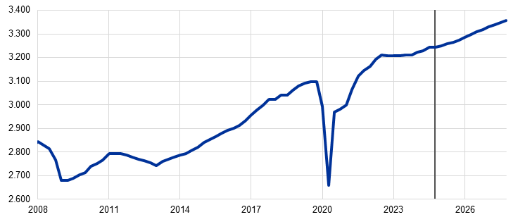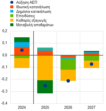 Μεσοπρόθεσμα, η αύξηση του πραγματικού ΑΕΠ αναμένεται να επιταχυνθεί, υποβοηθούμενη από την άνοδο της κατανάλωσης, τη βελτίωση των επενδύσεων και της εξωτερικής ζήτησης, καθώς και από την εξασθένηση των αρνητικών επιδράσεων από την προηγηθείσα αυστηροποίηση της νομισματικής πολιτικής (Πίνακας 3). Η συνεχιζόμενη ενίσχυση της αγοραστικής δύναμης των νοικοκυριών, λόγω της ανθεκτικής ανόδου των μισθών και της απασχόλησης και της υποχώρησης του πληθωρισμού, αναμένεται να στηρίξει την αύξηση της ιδιωτικής κατανάλωσης. Οι δαπάνες των νοικοκυριών προβλέπεται να συνεχίσουν να στηρίζουν την ανάκαμψη σε μεσοπρόθεσμο ορίζοντα, υποβοηθούμενες επίσης από τη μείωση του ποσοστού αποταμίευσης των νοικοκυριών από τα σημερινά ακόμη υψηλά επίπεδα. Η ανθεκτική, αν και επιβραδυνόμενη, αγορά εργασίας και η σταδιακή ανάκαμψη, βάσει των υποθέσεων, της εμπιστοσύνης των καταναλωτών αναμένεται επίσης να στηρίξουν την αύξηση της ιδιωτικής κατανάλωσης. Οι επενδύσεις προβλέπεται να ενισχυθούν σταδιακά στη διάρκεια του χρονικού ορίζοντα προβολής, αντανακλώντας κυρίως τη φθίνουσα ανασταλτική επίδραση από την προηγηθείσα αυστηροποίηση της νομισματικής πολιτικής καθώς και τη στήριξη που προέρχεται από την αύξηση των κερδών, την αξιοποίηση των πόρων του προγράμματος Next Generation EU (NGEU) και τη βελτίωση της εγχώριας και εξωτερικής ζήτησης. Η βελτίωση της εξωτερικής ζήτησης αναμένεται επίσης να στηρίξει την αύξηση των εξαγωγών, αλλά η αβεβαιότητα σχετικά με την εμπορική πολιτική, σε συνδυασμό με τα παρατεταμένα ζητήματα ανταγωνιστικότητας της ζώνης του ευρώ, συνεπάγεται συνεχείς απώλειες εξαγωγικών μεριδίων. Η συνεχιζόμενη απόσυρση των μέτρων δημοσιονομικής στήριξης που εφάρμοσαν οι κυβερνήσεις για την αντιμετώπιση της πανδημίας και της ενεργειακής κρίσης εκτιμάται ότι θα συνεχίσει να έχει μικρή αρνητική επίδραση στην αύξηση του ΑΕΠ τα έτη 2025-27.