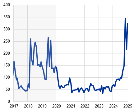 Further US tariff announcements, that were not in place when the March 2025 staff projections were finalised, have also not been included in the baseline, as there is a high degree of uncertainty surrounding their implementation. The US Administration announced on 10 February that a 25% tariff rate on steel and aluminium would be reinstated on 12 March. Owing to the small share of these goods in US imports (2%), the impact is expected to be limited on aggregate. President Trump directed his advisers to devise a comprehensive plan for so-called reciprocal tariffs on 12 February, announced global tariffs on cars, pharmaceuticals, and semiconductors on 18 February, argued for a review of trade partners with regard to digital services on 21 February, launched an investigation of copper tariffs on 25 February, and announced a 25% tariff on imports from Europe on 26 February as well as additional 10% tariffs for imports from China on 27 February. Finally, the “America First Trade Policy” memorandum signed by President Trump on 20 January 2025 could pave the way for additional tariffs, notably on the grounds of national security. Overall, there is currently high uncertainty with respect to the target, size and timing of future tariffs, as well as the response by the countries that would be affected. Given the high degree of openness of the euro area economy, with the United States being a key trading partner, the implementation of further tariffs by the US Administration and the associated uncertainty pose risks to the economic outlook for the euro area.
