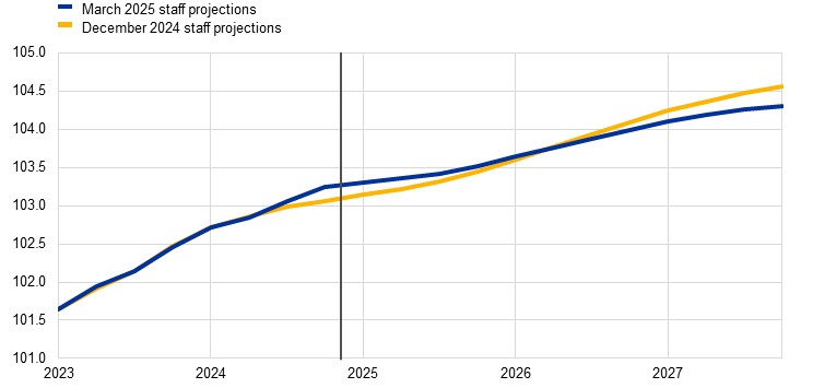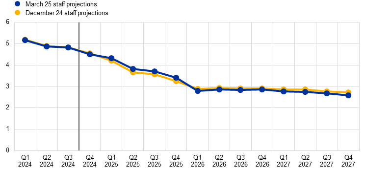 Headline HICP inflation has increased over recent months but is projected to moderate marginally in the course of 2025 and then to decline and hover around the ECB’s inflation target of 2.0% from the first quarter of 2026. At the start of the projection horizon upward base effects in the energy component and higher food price inflation are expected to broadly offset downward impacts from a decline in HICP inflation excluding energy and food (HICPX). The rise in energy commodity prices at the turn of the year will carry over into the annual rate of change in energy prices in 2025. Although oil and gas prices are assumed to decline in line with futures prices, energy inflation is likely to continue to record positive rates, albeit below the historical average, over the entire projection horizon. In 2027 energy inflation is seen to be driven up by the introduction of new climate change mitigation measures. Food inflation is projected to rise until mid-2025, mainly driven by recent robust increases in food commodity prices, before declining to stand at an average of 2.2% in 2027. HICPX inflation is expected to start to decline in early 2025 as the effects of lagged repricing fade, wage pressures recede and the impact from past monetary policy tightening continues to feed through to consumer prices. The decline in HICPX inflation is expected to be mainly driven by a decrease in services inflation – which has thus far been relatively persistent. Overall, HICPX inflation is projected to moderate from 2.2% in 2025 to 1.9% in 2027. Wage growth should continue to follow a downward path from the current still elevated levels as inflation compensation pressures fade. Coupled with the anticipated recovery in productivity growth, this is expected to lead to significantly slower growth in unit labour costs. As a result, domestic price pressures are projected to continue to ease, with profit margins recovering over the projection horizon. External price pressures, as reflected in import prices, are expected to remain moderate assuming that EU trade tariff policies remain unchanged. Compared with the December 2024 projections, the outlook for headline HICP inflation has been revised up by 0.2 percentage points for 2025 on account of higher energy commodity price assumptions and the depreciation of the euro, while it has been marginally revised down for 2027 owing to a slightly weaker outlook for the energy component at the end of the horizon.