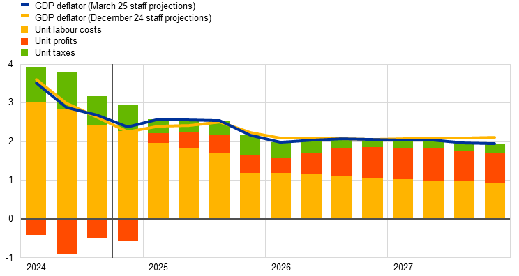 Overall, domestic price pressures, as measured by the growth of the GDP deflator, are projected to continue to decrease, despite growth in profit margins gathering pace in the second half of the horizon in line with the economic recovery (Chart 14). The annual growth rate of the GDP deflator fell quickly during 2024, and is estimated to have averaged 2.9% for the year (after 5.9% in 2023). This was triggered by a fall in the contribution from labour costs and a negative contribution from unit profits. However, GDP deflator growth is projected to decline more gradually from this year, to stand at an average of 2.0% in both 2026 and 2027. As growth in unit labour costs moderates and other input cost dynamics remain contained, unit profit growth is expected to recover somewhat from 2025, aided by the economic recovery, strengthening productivity growth and a temporary boost in 2027 related to the statistical treatment of ETS2.[9] Compared with the December 2024 projections, GDP deflator growth has been revised slightly down for 2026 and 2027. Unit profit growth has been revised down for 2025 and slightly up for 2026, largely offsetting the corresponding upward and downward revisions to unit labour cost growth.