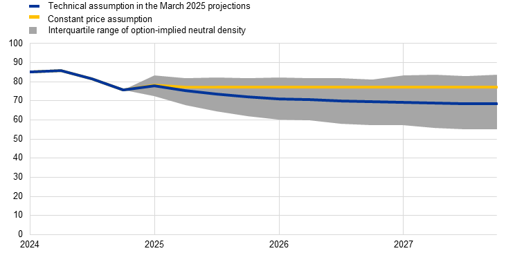 Compared with the December 2024 projections, the main changes to the technical assumptions are higher commodity prices and a weaker exchange rate, while interest rate assumptions are broadly unchanged. Oil price assumptions have been revised up by 4% for 2025 and are broadly unchanged for the rest of the projection horizon, while those for gas, electricity and Emissions Trading System 1 have been revised up more substantially and throughout the horizon. Energy prices are, however, still assumed to decline over the projection horizon. Non-energy commodity prices have been revised up for 2025 on the back of a rise in global food commodity prices. The euro has depreciated by 2.1% against the US dollar and by 1.0% in nominal effective terms since the previous projections. Market expectations for short-term and long-term interest rates are broadly unchanged.