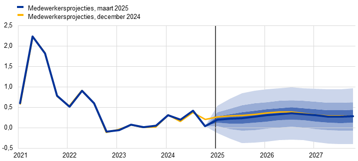Projecties ECB-medewerkers | Maart 2025 | 0,8 | 0,9 | 1,2 | 1,3 | 2,4 | 2,3 | 1,9 | 2,0 | 2,8 | 2,2 | 2,0 | 1,9 |