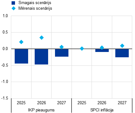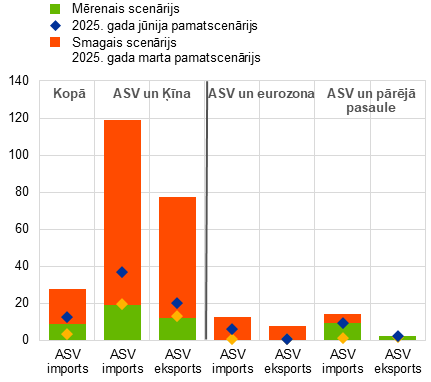 Lai ilustrētu ASV tarifu politikas radītos riskus un pašreizējo lielo nenoteiktību, kas saistīta ar eurozonas tautsaimniecības perspektīvu, sagatavoti divi scenāriji. Mērenais scenārijs paredz ASV un ES divpusējo tarifu atcelšanu (t. i., nulles līmeņa tarifus) un tirdzniecības politikas nenoteiktības strauju samazināšanos līdz līmenim, kāds bija pirms 2018. gada. Saskaņā ar šādu scenāriju izaugsme 2025. un 2026. gadā ir par 0.3–0.4 procentu punktiem spēcīgāka nekā pamatscenārijā, savukārt inflācija 2026. un 2027. gadā ir tikai nedaudz augstāka. Smagais scenārijs paredz turpmāku ASV tarifu palielināšanos visās jomās (atbilstoši ASV paziņojumam par tā dēvētajiem atbildes tarifiem), simetriskiem ES pretpasākumiem un ilgstoši pieaugošu tirdzniecības politikas nenoteiktību. Šādā scenārijā izaugsmes perspektīva visā iespēju aplēšu periodā ir daudz vājāka, savukārt inflācija ir zemāka, īpaši vēlāk iespēju aplēšu periodā. Šie scenāriji sīkāk aprakstīti 2. ielikumā.