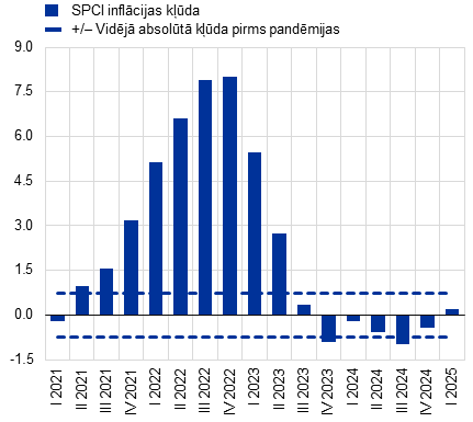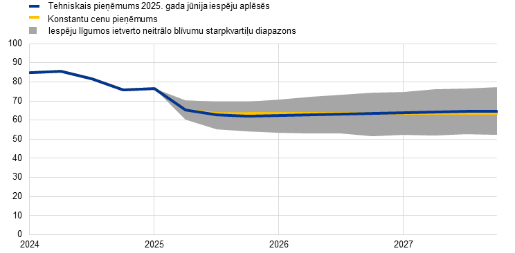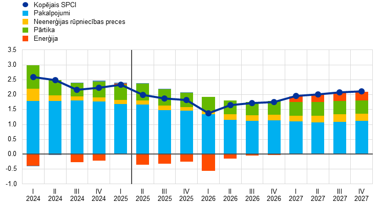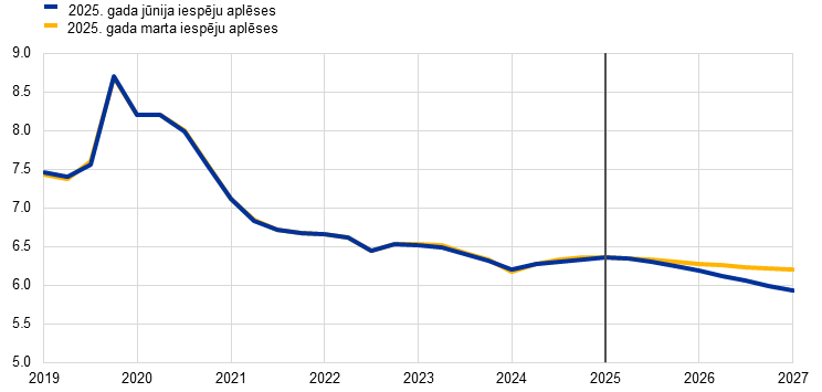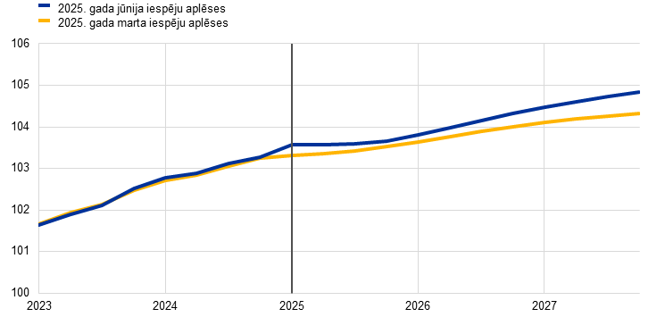 Lai gan gaidāms, ka kopējā inflācija, ko mēra ar saskaņoto patēriņa cenu indeksu (SPCI), īstermiņā saglabāsies zemāka par 2 %, gaidāms, ka vidējā termiņā tā atgriezīsies mērķa līmenī. Paredzams, ka inflācija 2025. gadā pazemināsies un 2026. gada 1. ceturksnī sasniegs zemāko līmeni (1.4 %), bet pēc tam 2027. gadā atkal sasniegs 2.0 %. Tiek uzskatīts, ka kopējās inflācijas pazemināšanos 2025. gadā daļēji nosaka negatīva enerģijas cenu inflācija pēc nesenā naftas cenu un dabasgāzes vairumtirdzniecības cenu krituma. Gaidāms, ka enerģijas cenu inflācija saglabāsies negatīva līdz 2027. gadam, kad jaunās emisijas kvotu tirdzniecības sistēmas (ETS2) kontekstā stāsies spēkā jauni klimata pārmaiņu mazināšanas pasākumi. Gaidāms, ka pēc īslaicīga kāpuma 2025. gada 2. ceturksnī pārtikas cenu inflācija saruks, 2027. gadā sasniedzot līmeni nedaudz virs 2 %. Gaidāms, ka SPCI inflācija (neietverot enerģijas un pārtikas cenas; SPCIX) pakalpojumu komponenta ietekmē samazināsies, izzūdot dažu preču novēloto cenu korekciju ietekmei, mazinoties darba samaksas spiedienam un zemākām enerģijas cenām izplatoties pa cenu noteikšanas ķēdi visā tās garumā. Darba samaksas kāpumam vajadzētu turpināt sarukuma tendenci, izzūdot spiedienam kompensēt agrākos reālās darba samaksas zaudējumus. Gaidāms, ka tas apvienojumā ar darba ražīguma kāpuma atjaunošanos noteiks būtiski lēnāku vienības darbaspēka izmaksu pieaugumu. Gaidāms, ka ārējais cenu spiediens, ko atspoguļo importa cenas, joprojām būs mērens, pieņemot, ka ES tarifu politika nemainīsies, un būs vērojams neliels lejupvērsts spiediens, ko radīs euro kursa kāpums un enerģijas izejvielu cenu sarukums pēdējos mēnešos. Salīdzinājumā ar 2025. gada marta iespēju aplēsēm kopējās SPCI inflācijas perspektīva gan 2025., gan 2026. gadā koriģēta un samazināta par 0.3 procentu punktiem, ņemot vērā pieņēmumus par zemākām enerģijas izejvielu cenām un euro kursa kāpumu, savukārt 2027. gadā tā nav koriģēta.