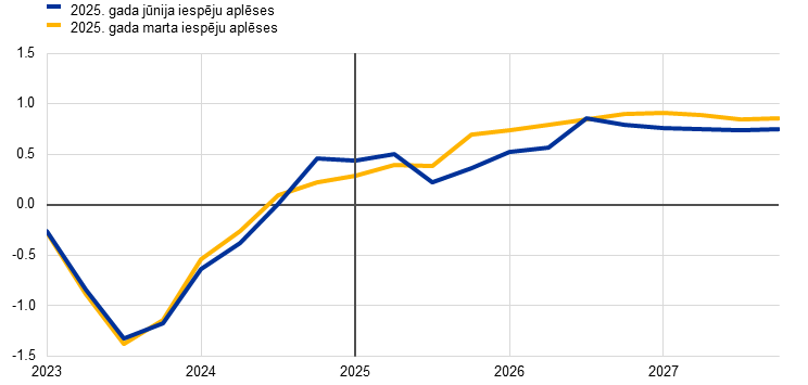 Piezīmes. Reālā IKP datu pamatā ir sezonāli un atbilstoši darbadienu skaitam koriģēti gada vidējie dati. Vēsturiskie dati var atšķirties no jaunākajām Eurostat publikācijām, jo dati tiek publiskoti pēc iespēju aplēšu datu aktualizēšanas pēdējā datuma. Korekcijas aprēķina, izmantojot noapaļotus skaitļus. Alternatīvie scenāriji pievēršas ASV tarifiem un tirdzniecības politikas nenoteiktībai. Tie aprakstīti 2. ielikumā. 2025. gada jūnija pamatscenārijā izmantotos datus, t. sk. arī ceturkšņa datus, var lejupielādēt makroekonomisko iespēju aplēšu datubāzē ECB interneta vietnē.