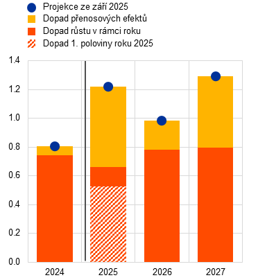 Revize projekcí růstu reálného HDP v porovnání s projekcemi z června 2025 – rozložení na přenosové efekty a růst během roku