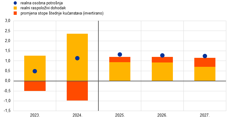 Rast realnog BDP‑a i dalje bi trebala poticati osobna potrošnja. Kada je riječ o rashodima (Grafikon 2., dio a)), u cijelom projekcijskom razdoblju predviđa se snažan rast osobne potrošnje, koja će dati najveći doprinos rastu realnog BDP‑a. Osim toga, državna potrošnja i ukupno ulaganje trebali bi se povećavati svake godine u razdoblju od 2025. do 2027., pri čemu bi privatna ulaganja trebala neutralizirati očekivani snažni učinak litice na području javnog ulaganja u 2027. kao posljedice prestanka financiranja bespovratnim sredstvima iz instrumenta NGEU. S druge strane, predviđa se da će doprinos neto izvoza rastu realnog BDP‑a u 2025. i 2026. biti negativan, pri čemu će doprinos uvoza (–1,2 postotna boda u 2025. i –0,9 postotnih bodova u 2026.) premašiti doprinos izvoza (0,6 postotnih bodova u 2025. i 0,5 postotnih bodova u 2026.), ali da će ga djelomično neutralizirati pozitivni doprinos promjena zaliha u 2025. (Grafikon 2., dio b)). Vrlo kolebljive promjene zaliha tijekom 2025. povezane su s gomilanjem i smanjivanjem zaliha zbog učinaka ubrzanja aktivnosti i potom njihova slabljenja.