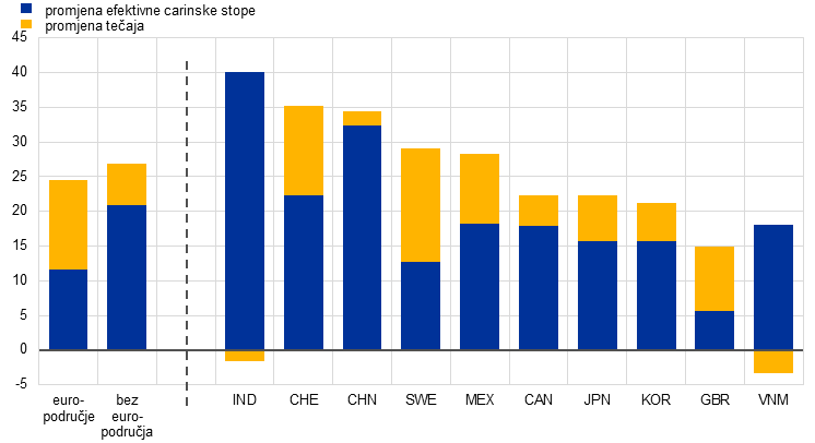 U odnosu na projekcije iz lipnja 2025. efektivne carinske stope SAD‑a na uvoz iz europodručja i svih trgovinskih partnera više su nakon sklapanja trgovinskog sporazuma između SAD‑a i EU‑a i drugih najava. U projekcijama stručnjaka ESB‑a u obzir se uzimaju te carinske stope, njihovo zamrzavanje i izuzeća koji su bili na snazi na krajnji datum za projekcije (28. kolovoza) te se pretpostavlja da će ostati na jednakoj razini tijekom cijelog projekcijskog razdoblja.