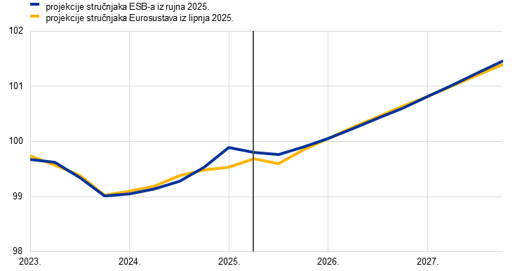 Inflacijski izgledi u skladu su sa stabiliziranjem inflacije na razinama oko srednjoročnog cilja od 2 %. Predviđa se da će ukupna inflacija mjerena harmoniziranim indeksom potrošačkih cijena (HIPC) uglavnom ostati nepromijenjena i iznositi oko 2 % u preostalom dijelu 2025. te da će se potom smanjiti na 1,7 % u 2026. i porasti na 1,9 % u 2027. Smanjenje u 2026. upućuje na daljnje postupno smanjenje komponenata inflacije bez energije. Inflacija cijena energije trebala bi pak i nadalje biti kolebljiva, ali porasti tijekom projekcijskog razdoblja, djelomično zbog uvođenja sustava EU‑a za trgovanje emisijama (ETS2) u 2027. Očekuje se da će inflacija cijena hrane u početku ostati povišena zbog prijenosa odgođenih učinaka prošlih povećanja međunarodnih cijena prehrambenih sirovina, ali da će se u 2026. i 2027. smanjiti na razine malo više od 2 %. Inflacija mjerena HIPC‑om bez energije i hrane trebala bi se smanjiti kako budu popuštali pritisci plaća i smanjivala se inflacija cijena usluga te kako se aprecijacija eura bude prenosila kroz cjenovni lanac i ograničavala inflaciju cijena dobara. Očekuje se da će manji rast plaća, kao posljedica nadoknađivanja prošlog pada realnih plaća, zajedno s oporavkom rasta produktivnosti znatno usporiti rast jediničnih troškova rada. U odnosu na projekcije iz lipnja 2025. izgledi za ukupnu inflaciju mjerenu HIPC‑om revidirani su naviše za 0,1 postotni bod za 2025. i 2026. zbog viših stvarnih i pretpostavljenih cijena energenata te zbog odgođenih učinaka viših međunarodnih cijena prehrambenih sirovina, koji više nego neutraliziraju aprecijaciju eura. Kada je riječ o 2027., predviđa se da će prevladavati odgođeni učinci aprecijacije eura, zbog čega je došlo do revizije naniže za 0,1 postotni bod.