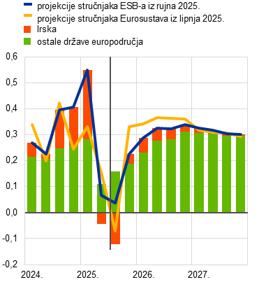 U odnosu na projekcije iz lipnja 2025. rast realnog BDP‑a revidiran je naviše za 0,3 postotna boda za 2025. i naniže za 0,1 postotni bod za 2026., a za 2027. ostao je nepromijenjen. Revizija naviše projekcije za 2025. posljedica je pozitivnih učinaka prijenosa koji proizlaze iz revizija povijesnih podataka te znatno boljih ostvarenja u prvom tromjesečju 2025. nego što se očekivalo i najnovijih pokazatelja koji upućuju na blagu reviziju naviše rasta u trećem tromjesečju (Grafikon 3.). Malo više carine, slabija inozemna potražnja i slabljenje cjenovne konkurentnosti povezano sa snažnijim eurom više nego neutraliziraju utjecaj poboljšanja pouzdanja na gospodarsku aktivnost, zbog čega su izgledi za rast u 2026. revidirani naniže za 0,1 postotni bod. Izgledi za 2027. ostali su nepromijenjeni. Kada je riječ o komponentama rashoda (Grafikon 2., dio b)), najveće revizije za 2025. odnose se na ulaganje (više od polovice povezano je s kolebljivim ulaganjem u proizvode intelektualnog vlasništva u Irskoj) i neto izvoz.