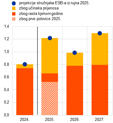 Izvori: Consensus Economics Forecasts, 14. kolovoza 2025. (podatci za 2027. uzeti su iz ankete iz srpnja 2025.); ESB‑ova Anketa o prognozama stručnjaka, 25. srpnja 2025.; Svjetski gospodarski izgledi MMF‑a, 23. srpnja 2025.; Gospodarski izgledi OECD‑a, 3. lipnja 2025.; Ekonomska prognoza Europske komisije iz proljeća 2025., 19. svibnja 2025.