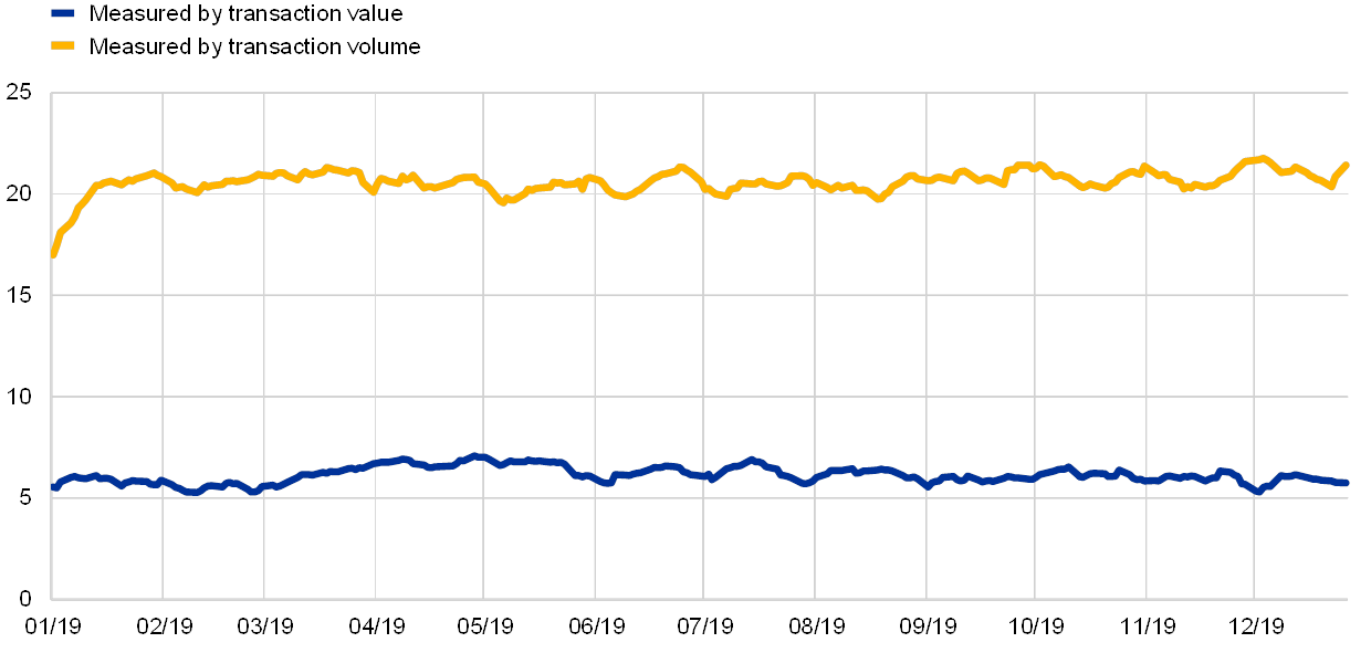 Throughout 2019, the amplitude of TARGET2 turnover, expressed by the difference between the highest and the lowest values, was 52%, compared with 48% the previous year. Overall, the average values throughout the year followed a well-established seasonal pattern.