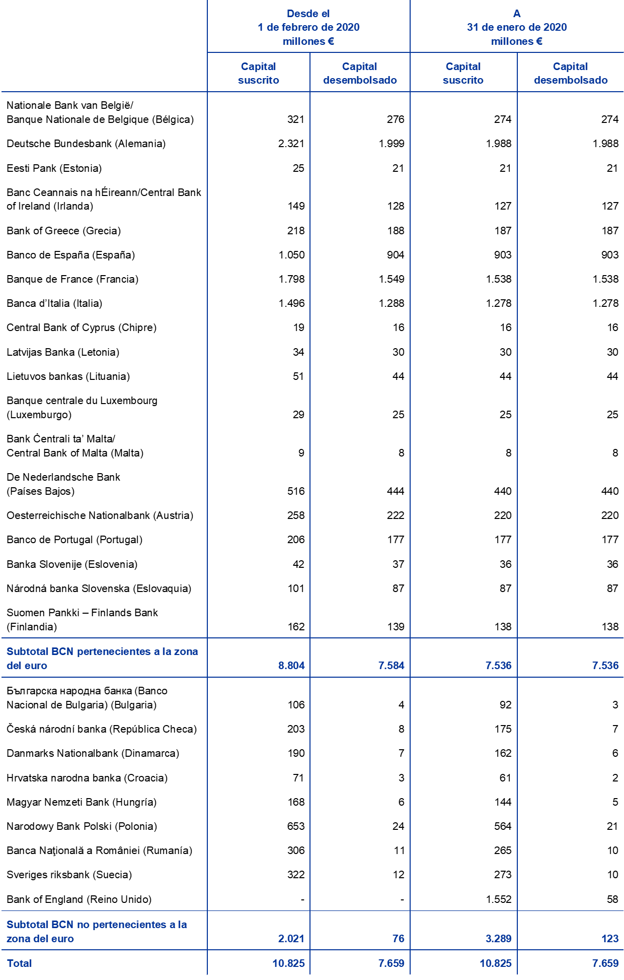- Véase la nota de prensa de 30 de enero de 2020 sobre el capital suscrito del BCE tras la salida del Bank of England del SEBC.