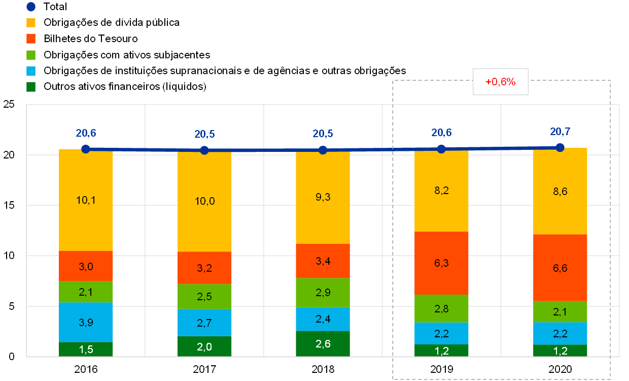 Em 2020, o valor da carteira de fundos próprios aumentou 0,1 mil milhões de euros, passando para 20,7 mil milhões de euros (ver o gráfico 8), principalmente devido ao reinvestimento dos juros gerados e ao aumento do valor de mercado dos títulos detidos na carteira. A carteira consiste sobretudo em títulos denominados em euros, valorizados a preços de mercado no final do exercício. Em 2020, os títulos de dívida pública representavam 73% do total da carteira.