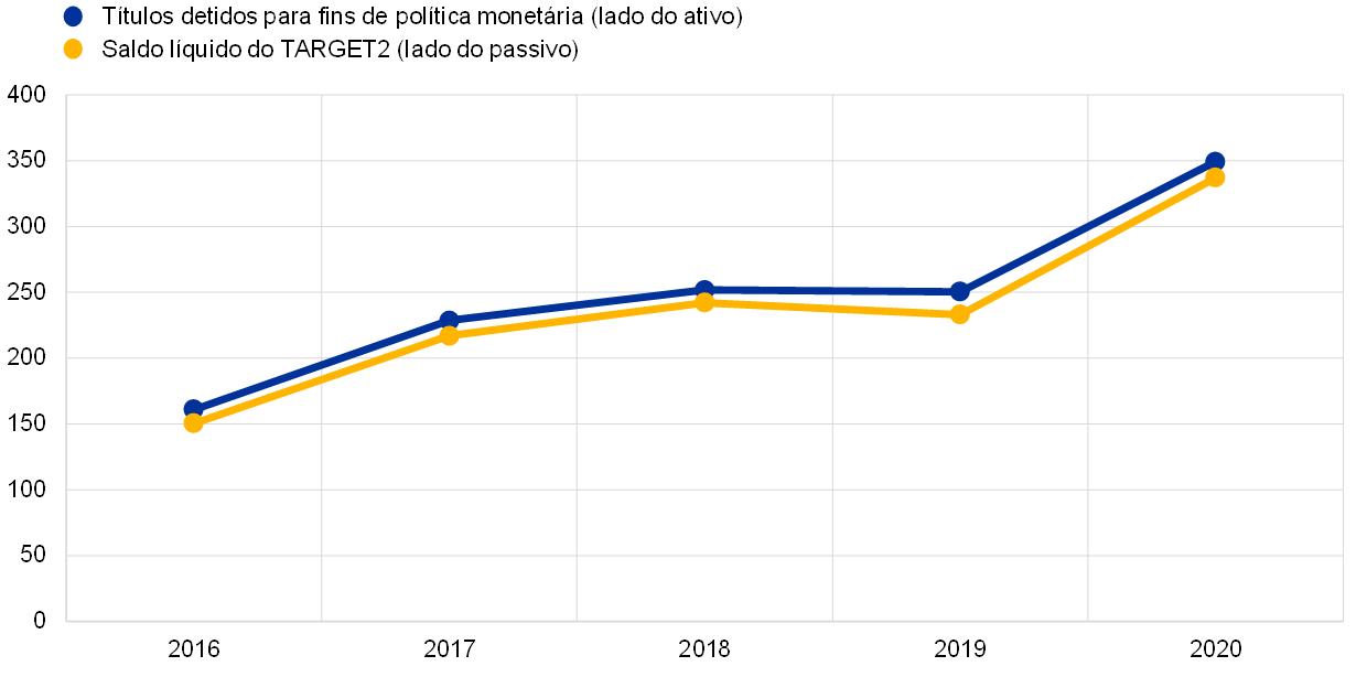 Em 2020, o total do ativo do BCE aumentou 112,2 mil milhões de euros, passando para 569,3 mil milhões de euros, devido sobretudo à quota do BCE nas aquisições de títulos ao abrigo do novo programa de compra de ativos devido a emergência pandémica (pandemic emergency purchase programme – PEPP)[6] e do APP. Essas aquisições resultaram num aumento da rubrica “Títulos detidos para fins de política monetária”, tendo a liquidação em numerário das mesmas, através de contas no TARGET2, levado a um aumento correspondente das “Responsabilidades intra‑Eurosistema”. O maior montante de notas de euro em circulação também contribuiu para este aumento.